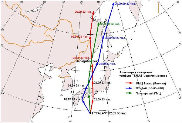 4 сентября тайфун с давлением в центре 990 гПа выйдет в центральную часть Японского моря. В Приморье начнутся дожди, наиболее интенсивные в восточной половине края. На побережье усилится северо-восточный северный ветер до 23-28, на мысах до 30-35 мс. Ночью 5 сентября тайфун «TALAS» выйдет на юго-восточное побережье Приморья. В крае дожди распространятся на всю территорию.