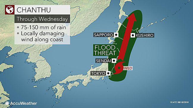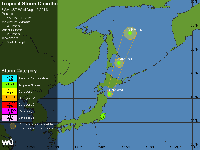 «Чанзу» обрушится на остров Хоккайдо в среду, 17 августа. Наихудшие погодные условия должны обойти Токио, больше всего пострадают такие области, как Сендай и дальше — восточная часть Хоккайдо. Усиление шторма к рангу тайфуна не ожидается. Тем не менее, некоторые части Японии могут столкнуться с сильным дождём и разрушительным ветром.